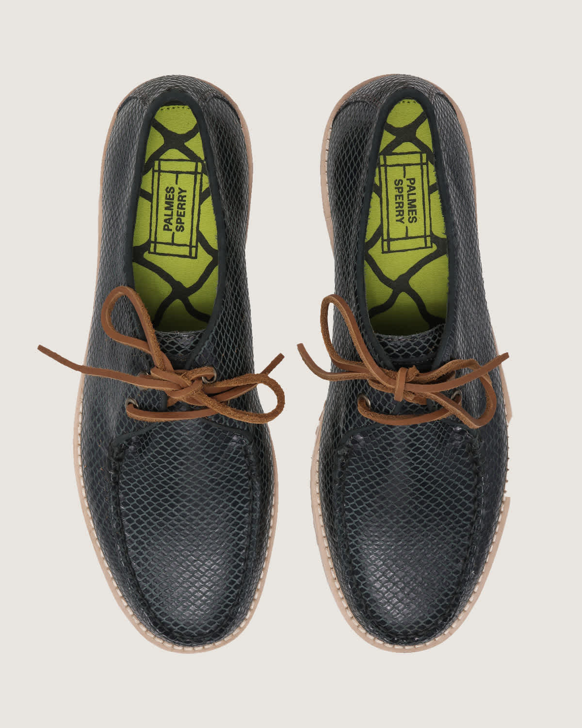 Upper in tennis ball felt, sourced from a family-owned tennis ball factory in southern England, sitting upon a double leather sole. Handmade in Portugal. Goodyear welted. Gold embossed collaborative branding