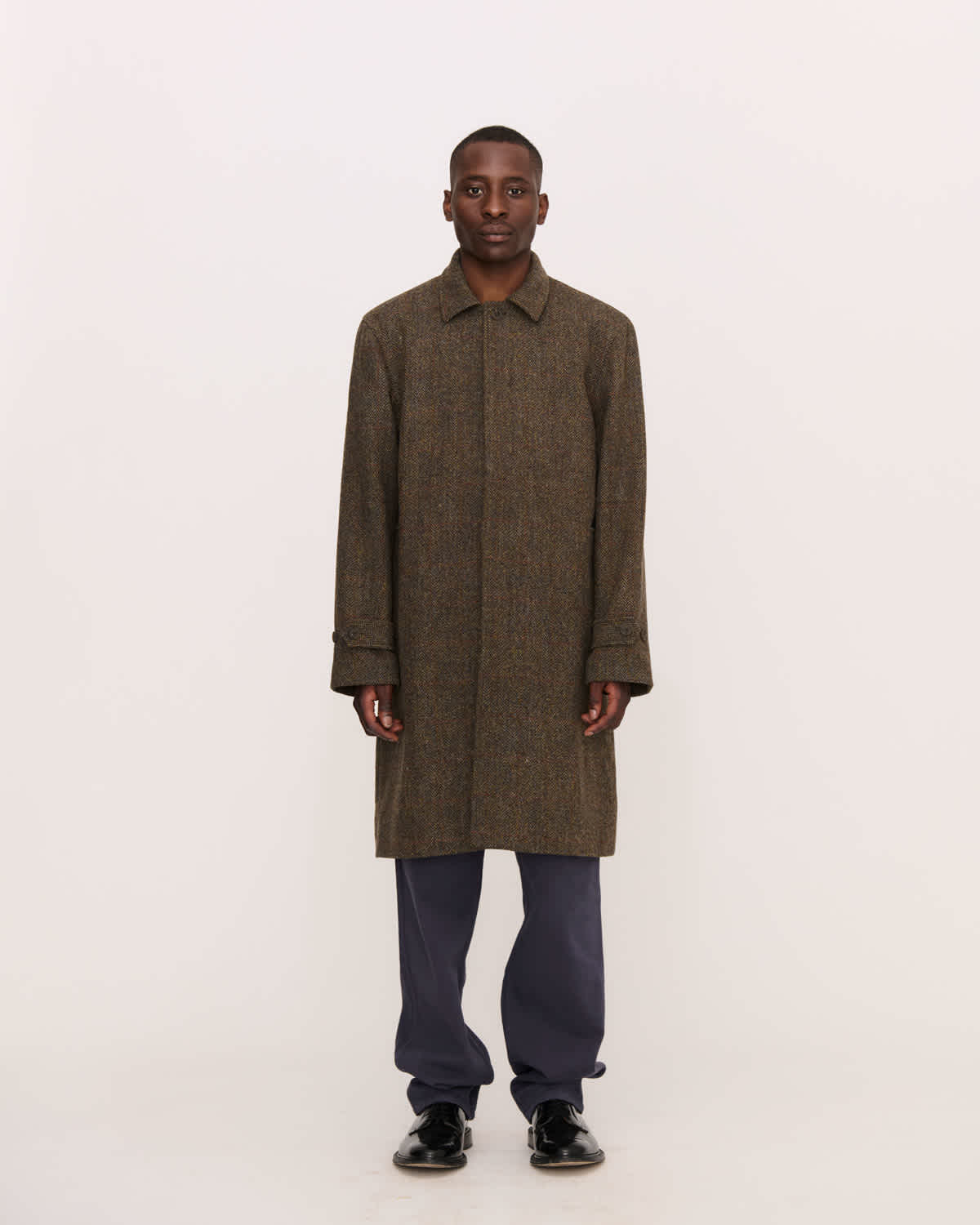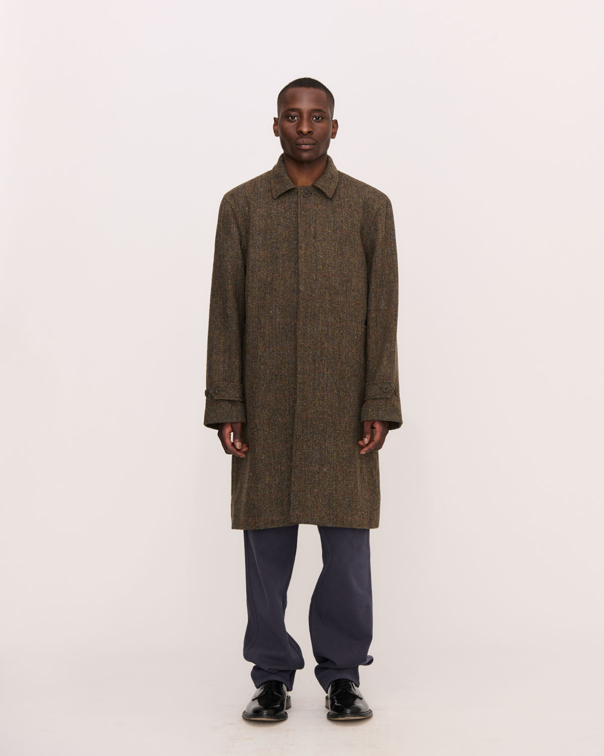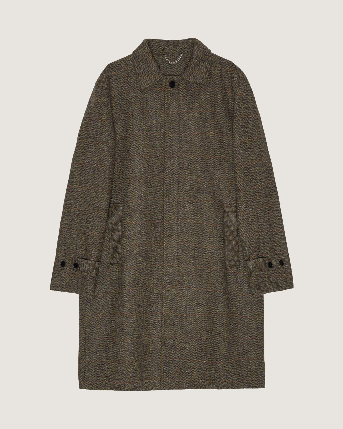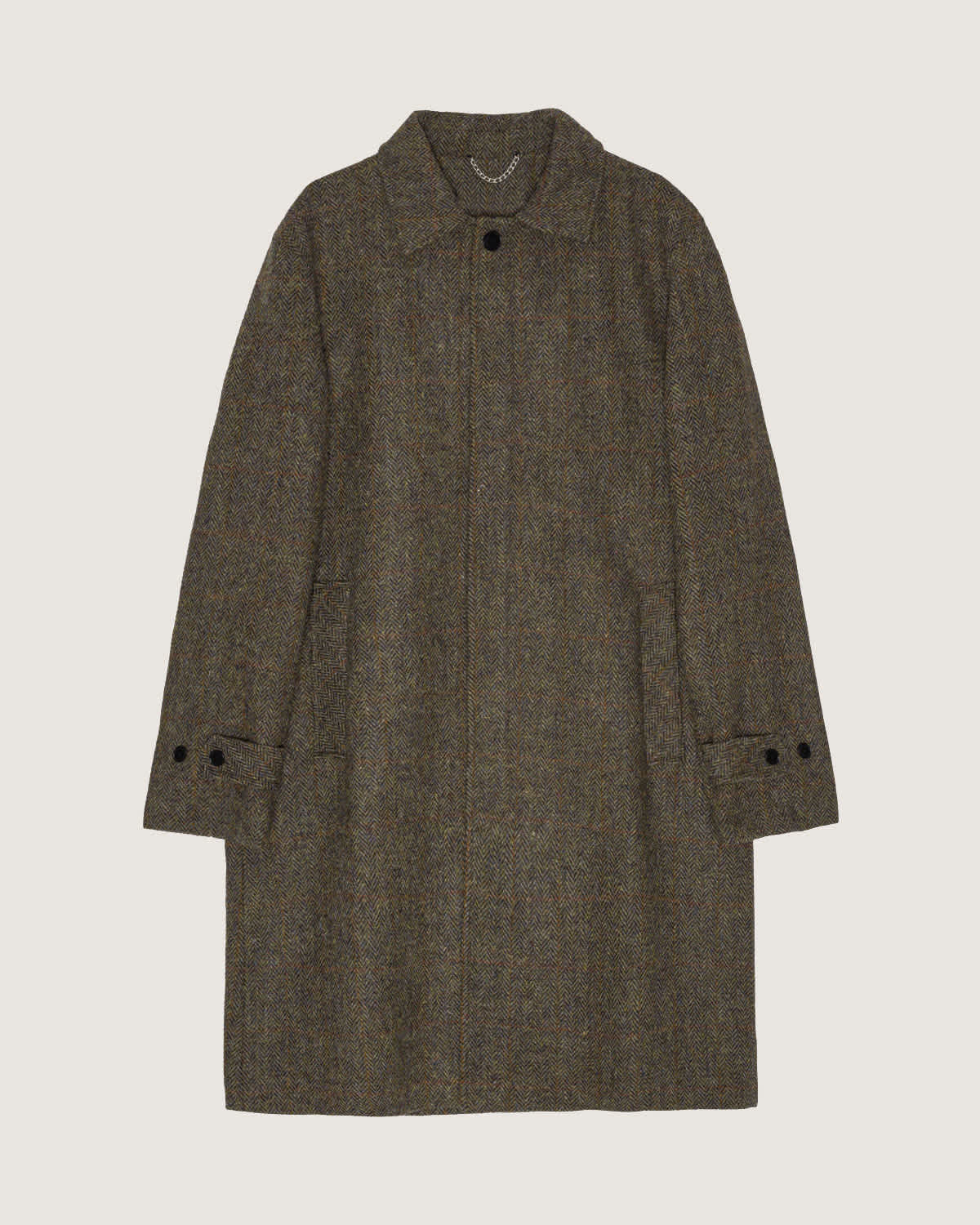 Features front welt pockets. Placket with hidden buttons; only top button is visible when closed. Body in 100% Virgin Wool Yorkshire Tweed by Abraham Moon, woven in UK. Lining in viscose. Single needle topstitch at cuff and hem. Strap at sleeve with 2 buttons for adjustments. Woven interior labels with original artwork by Leah Goren.