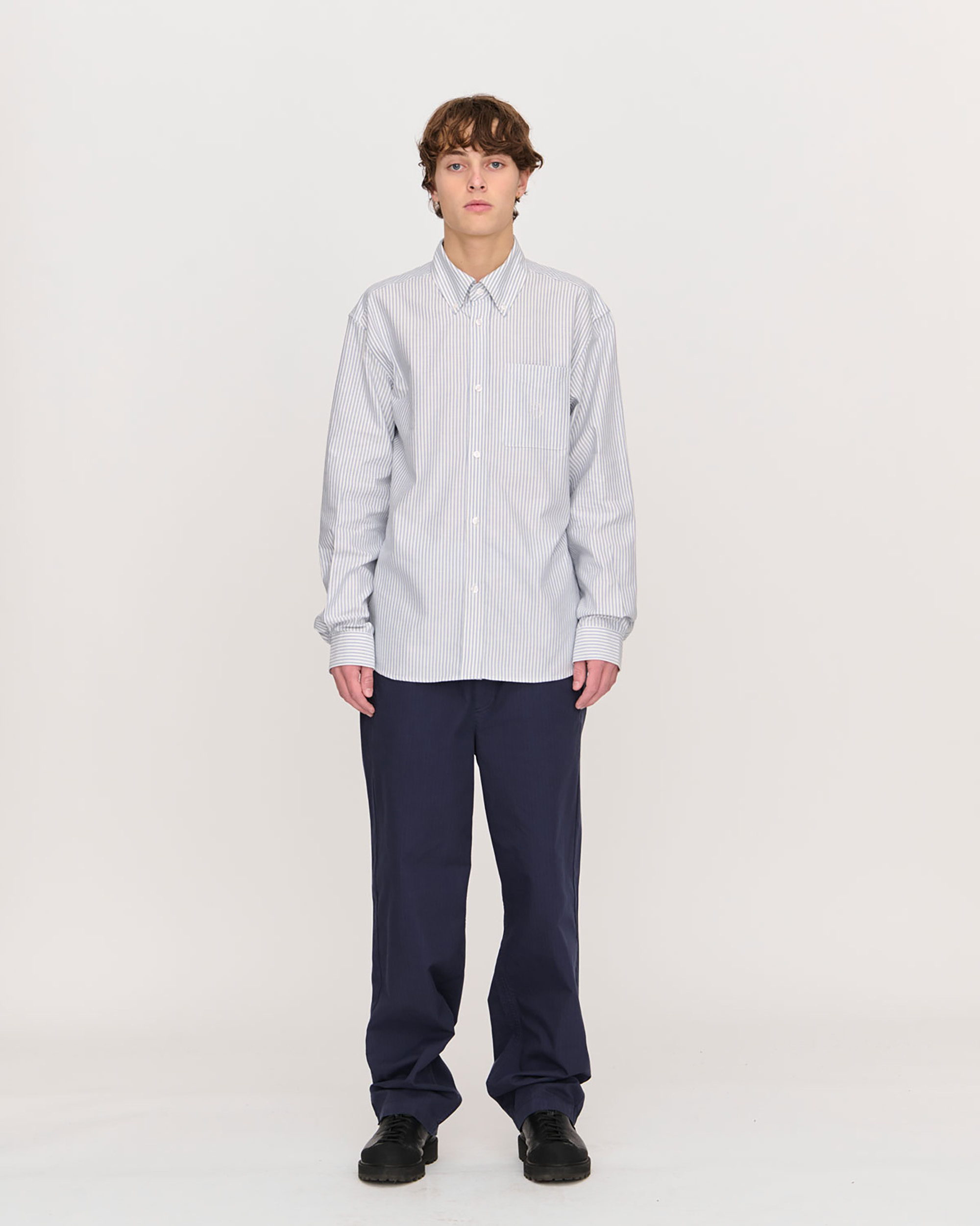 Our Lucien Trousers in a midweight cotton ripstop fabric, bringing a subtle tactility and added wearability to the garment. Has a slightly wide leg, elastic waistband with interior drawstring, slanted front pockets, sewn-on back pockets and woven label on back right pocket. 100% Cotton.