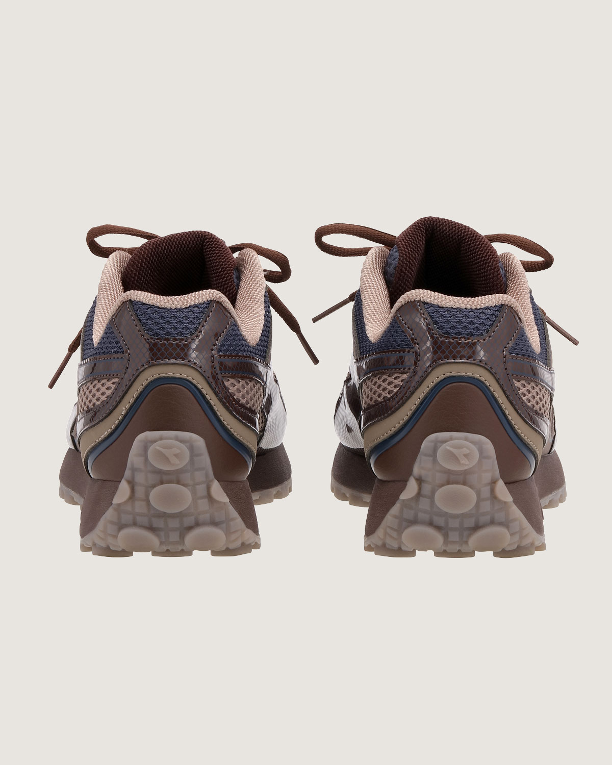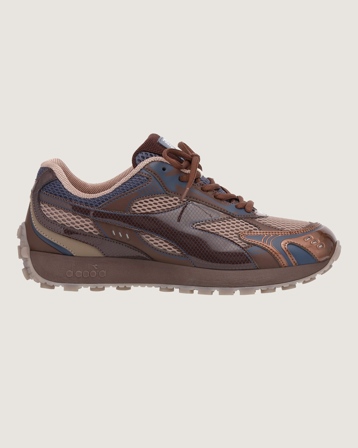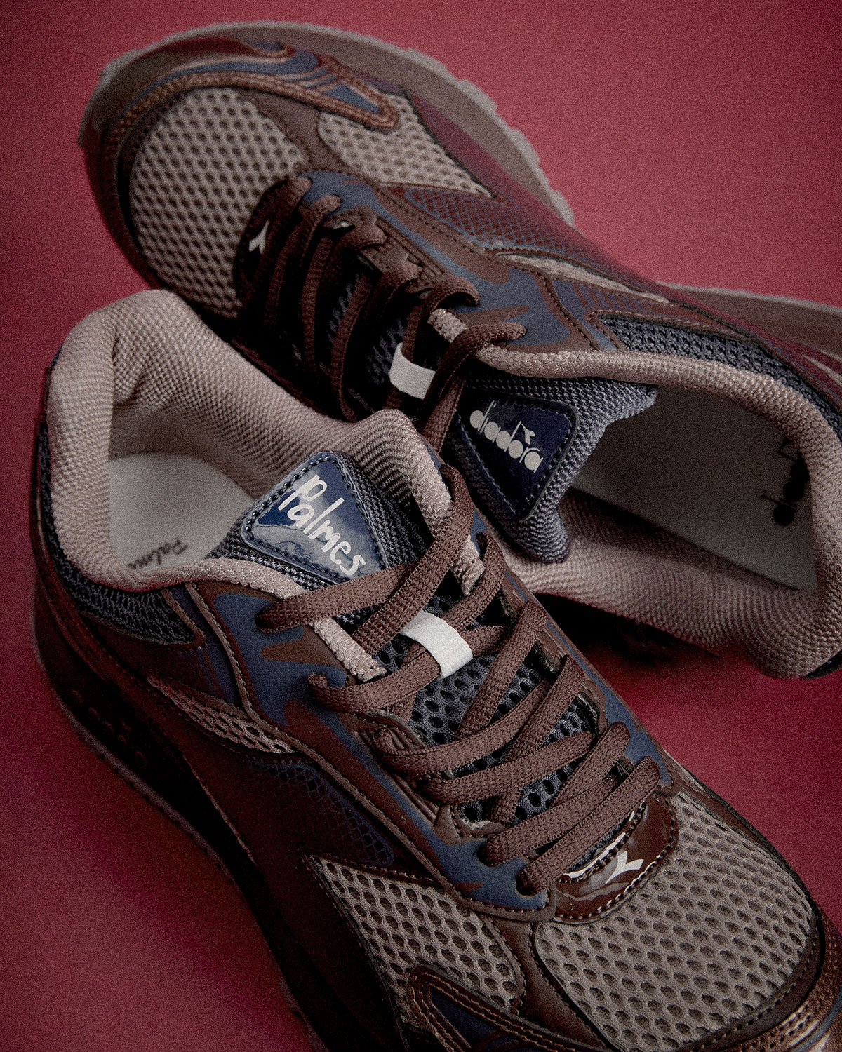 The Belluna by Palmes for Diadora Korea references the early 2000s running shoe silhouettes through an upper in elements of brown natural leather and mesh material, featuring contrast tones of navy and brown.