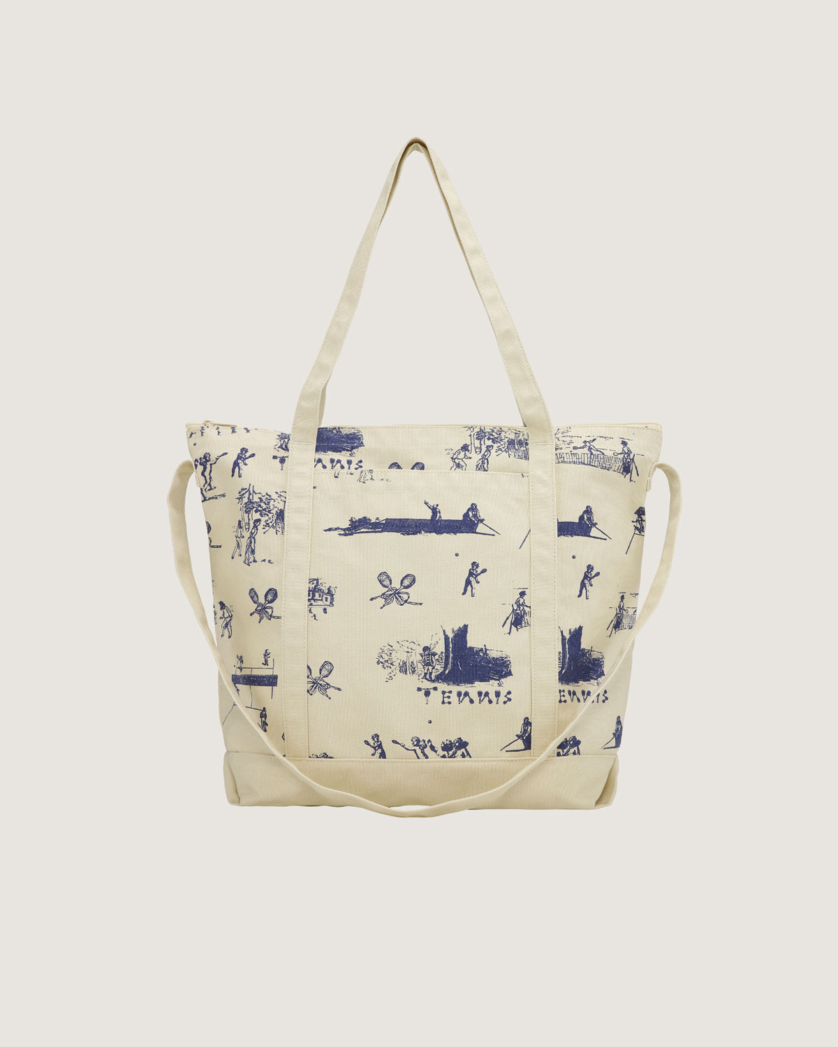 A large size tote bag in sturdy, 18 oz. cotton canvas. Features an all-over screen print alongside cross-body strap and shoulder handles. YKK Zipper. Pocket on front.